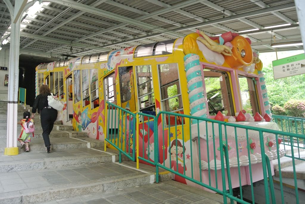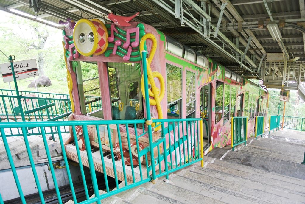 生駒ケーブルは、山麓の鳥居前駅から宝山寺駅で乗り換える。ここからは山上線で、もう2種類のケーブルカーに遭遇した。行きは「スイート」というケーキ、帰りは「ドレミ」という音楽をイメージしたこちらもインパクト抜群の車両だ。この山上線は中間駅2駅を経て、生駒山上駅に到着した。