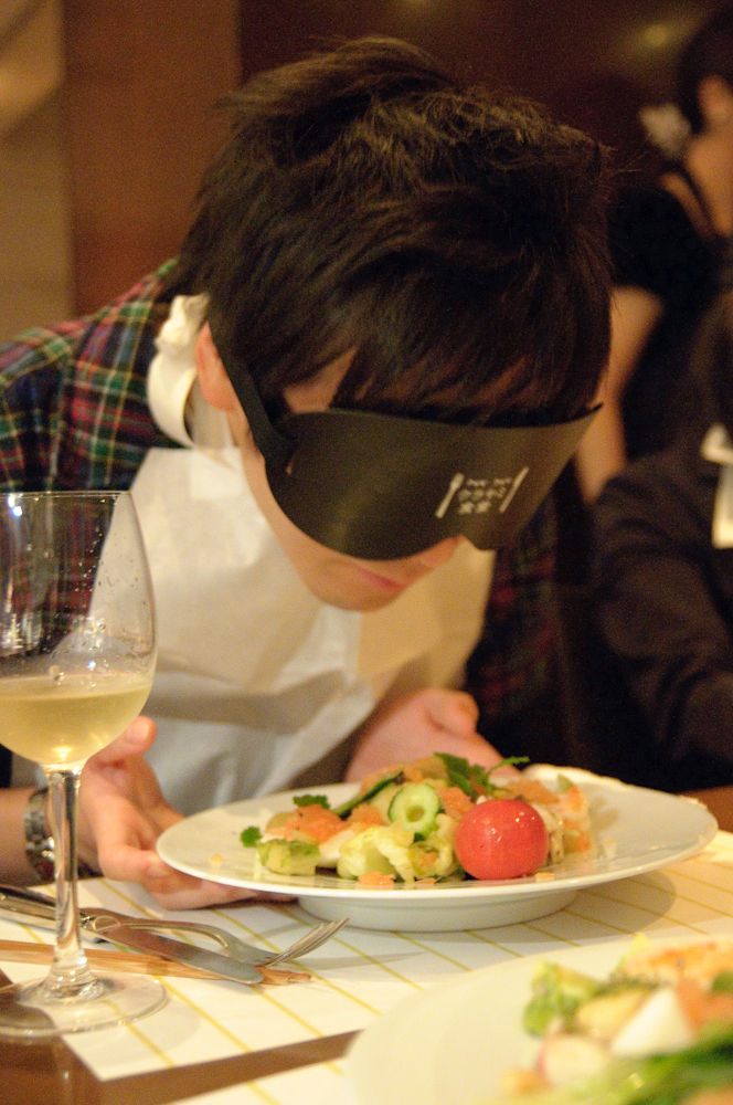 イベント名からは想像もつかないが、このイベントで行うのはなんと“フルコースの食事”。参加者は目隠しをされることで“暗闇”につつまれ、視覚以外の五感を駆使して食事を楽しむ。