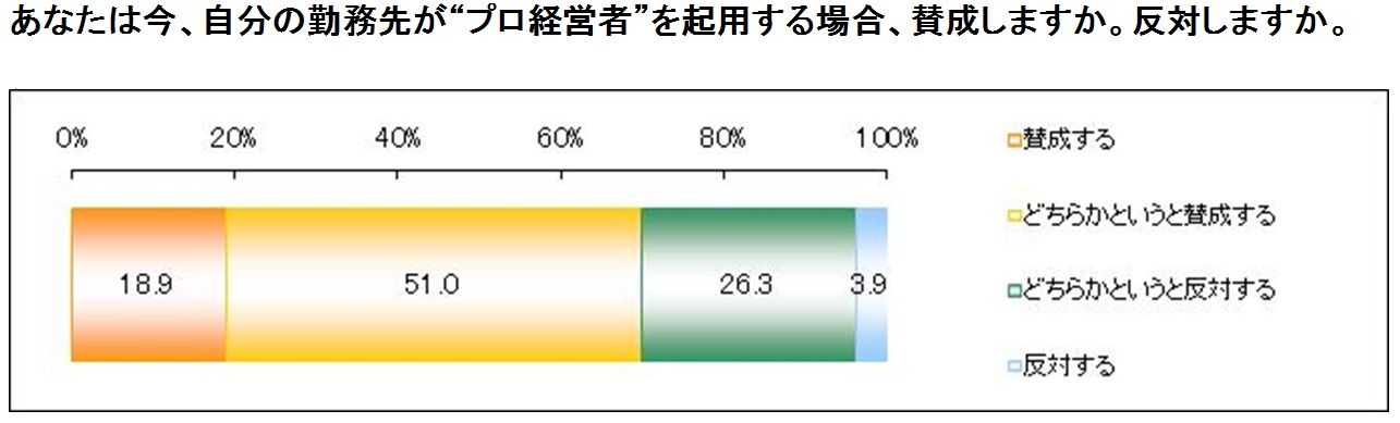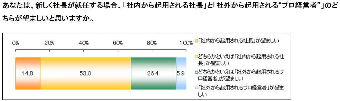 2つの調査結果を見ると、ビジネスパーソンや有力企業の社長の多くが、「プロ経営者」は増えていくものと受け入れているようだが、セルム調査では、67.8%が「新社長は、社内から起用される社長がのぞましい」と答えたり、日経新聞アンケートでは過半数が「自社での外部登用に慎重」となるなど、本音では、「プロ経営者」を手放しで評価しているということでもないようだ。