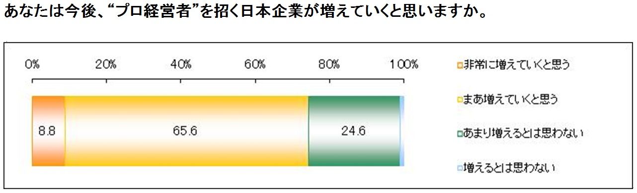 また、日経新聞が9月22日の朝刊で報じたところによると、「社長100人アンケート」の結果として、「トップの外部起用に2割が前向き」、「今後、日本企業でトップを外部から招く動きが増えると答えた社長は66.2%」となり、「国内有力企業でトップを社外から招く動きの広がる兆しがうかがえる結果になった」としている。