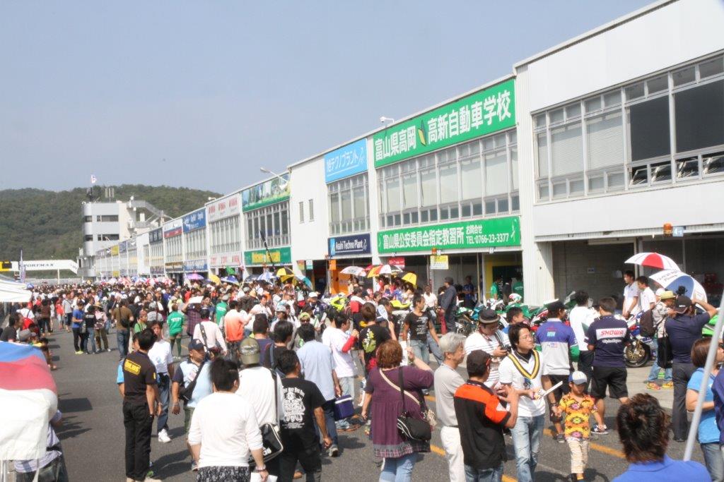この日はバイクの人気レース「MFJスーパーバイク全日本ロードレース選手権」が行われ、大勢の観戦客で賑わっていた。