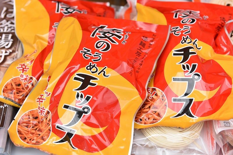 徳島名物・半田手延そうめんがスナックで味わえる「ピリ辛そうめんチップス」も注目。ふし麺を油で揚げ、ピリ辛に味付けされている。子どものおやつ、お酒のおつまみにもピッタリ。