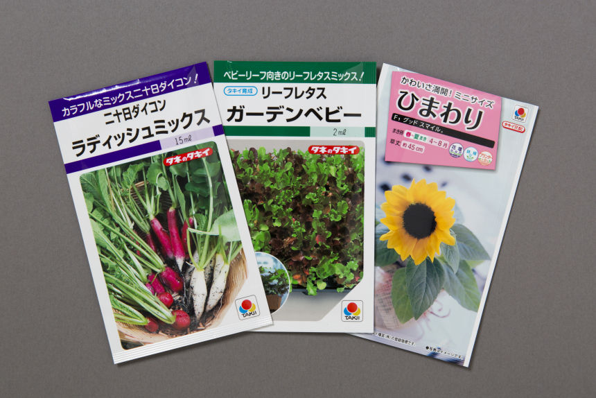 サラダに入れると彩りも鮮やかになる二十日大根『ラディッシュミックス』やベビーリーフ『ガーデンベビー』、背が低く、他の品種より早く花が咲き長く楽しめるヒマワリ『グッドスマイル』を集めたセット。