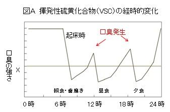 また唾液は、口臭の発生と大いに関連する。上のグラフをみても唾液分泌が低下しやすい時間帯といわれる、寝ている時、昼食前、夕食前にそれぞれ口臭の強さの値が強くなっている。