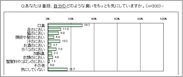 普段、自分のどのような臭いを最も気にするか尋ねたところ、29.7%が「口臭」と回答した。あわせて他人のどのような臭いが気になるか聞くと、こちらも「口臭」(32.0%)という回答が最かった。いずれも「汗の臭い」「タバコの臭い」といった回答を大きく引き離し、ダントツの1位という結果に。