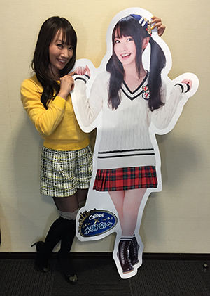 今回で第7弾を迎えるプレゼントキャンペーンの商品となったのは、Aコースは、ツインテとミニスカが眩しすぎる水樹奈々の「等身大ウォールステッカー」が77名様にBコースは、サインがプリントされた水樹奈々×カルビーのオリジナルコラボTシャツ