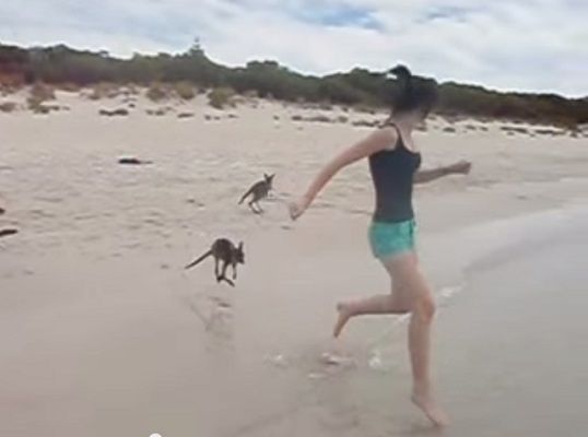 女性と一緒に浜辺を走り回るカンガルーの赤ちゃん。女性につられて海へ勢いよく飛び込んでいくが、自分が泳げなかったことに気づいたのか、あわてて浜辺まで戻る。