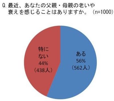 医療・介護・衛生用品メーカーの白十字株式会社が、全国の20代〜60代の男女1000名を対象におこなった意識調査によると、両親に老いや衰えを感じることがあるという人は半数以上の56%という結果となった。