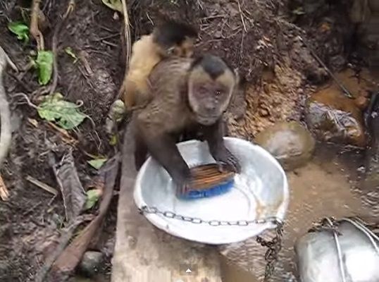 子供をおぶって洗い物をする猿。上手に道具を使って洗い物をしているその姿は、まるで人間のお母さん。