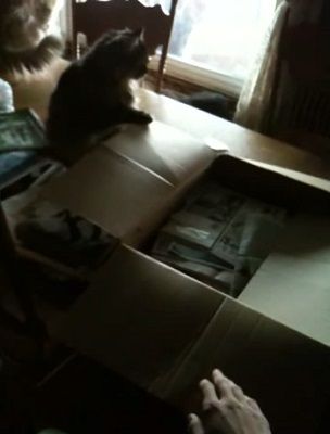 飼い主の動きにどうしても、つられてしまう猫。飼い主がダンボールの端をパタパタしていると、猫もつられてパタパタしてしまう。