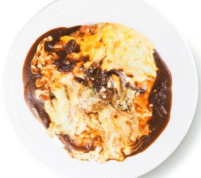 「トロトロ玉子のオムハヤチーズ ハンバーグON」は、トマトベースのしっとりリゾットライスとトロトロ半熟玉子に、じっくり煮込んだ洋食店のデミグラスシチューをたっぷりかけ、さらにオリジナルチーズフォンデューとじっくり煮込んだハンバーグをのせてある、15年間変わらない味のオムライス。