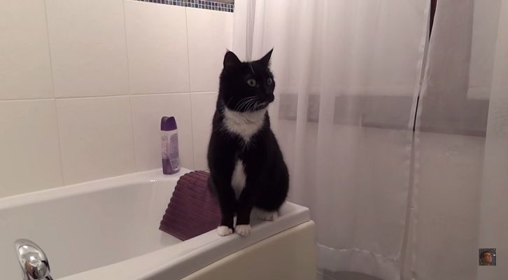 お風呂の鏡をじっと見つめる猫。すると、鏡を見ながら後ろ足だけで立ち、モデル?のようにポージングの練習を始める。