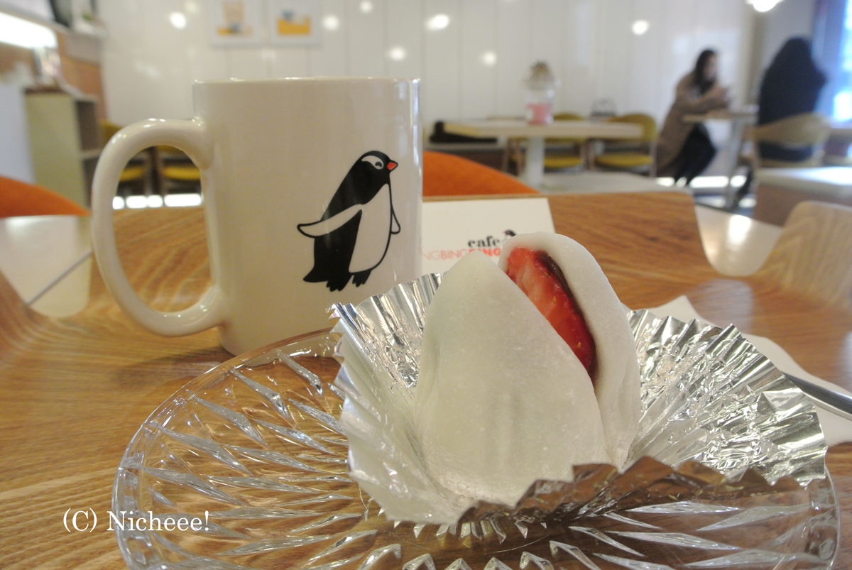韓国でいちご大福といってもピンとこないし、日本でも正直、カフェでわざわざ食べるというスイーツでもない。写真付きで、しかも中身が見える状態だったので、日本のいちご大福とさほど変わらないようにも感じ、試しにオーダーしてみた。1個2000ウォン(約200円)