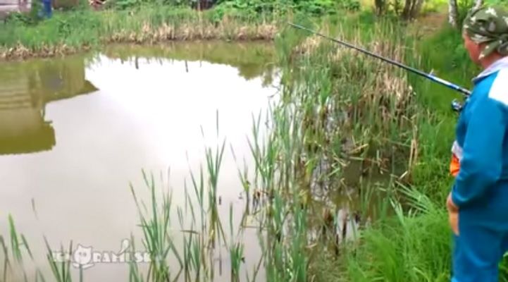 池で釣りを楽しむ男性。魚を釣ることに成功したが、池から陸に移動させた瞬間、待ち伏せしていた?猫が、見事に魚を奪って逃走する。