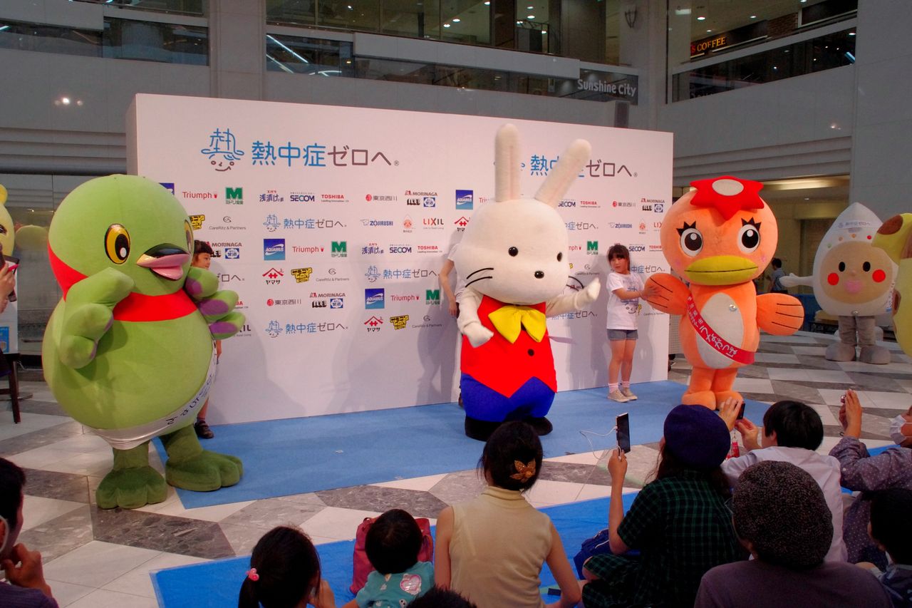 また、熱中症の危険度を見える化するために開発した「携帯型熱中症計」のマスコットキャラクター「熱中くん」のほか、各地のご当地キャラクターが会場に華をそえ、ところどころにキャラクターを囲む人だかりができていた。