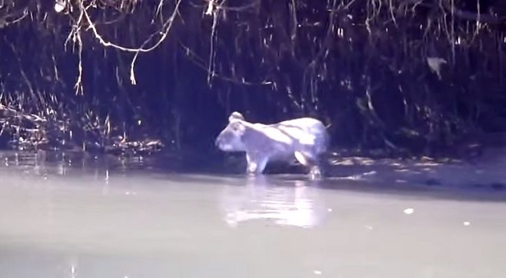 カヌーで川を下る観光客たち。すると、川岸にコアラが現れる。