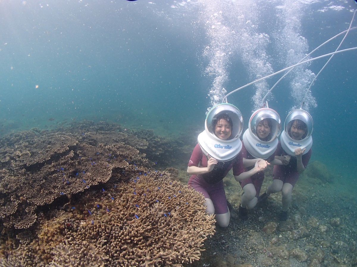 海中散歩では、目の前に美しいサンゴが広がり、色とりどりのかわいい魚たちも見られる。しかも、スタッフが写真を撮ってくれるので、旅の記念にもなってうれしい。シーウォーカー以外にも、大きなサーフボードに乗ってパドルで海面を漕いで進む「SUP」、2種類の海中展望船で熱帯魚やサンゴの楽園をめぐることもできる。