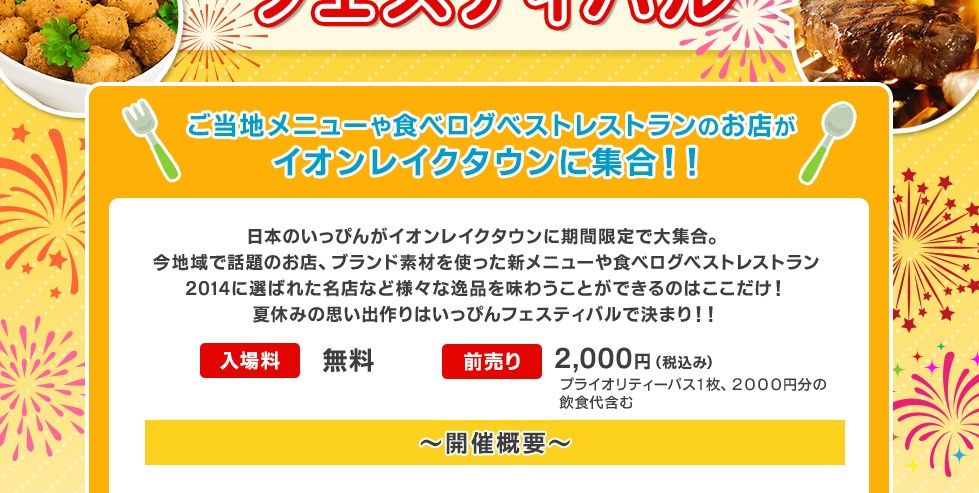 ■ご当地いっぴんフェスティバル( http://tabelog.com/campaign/ippinfes/ )日時:2015年8月7日(金)〜9日(日)/14日(金)〜16日(日) 11時〜21時※金曜日は20時終了料金:入場無料※飲食料金は各お店によって異なります。場所:イオンレイクタウン アウトレットQ駐車場 特設会場〒343−0828 埼玉県越谷市レイクタウン4丁目1番地1