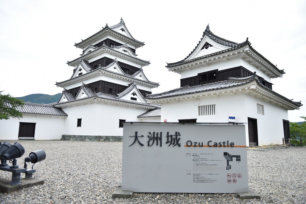 この大州城は、市内を流れる肱川の河畔に望む。鎌倉時代末期に築かれた地蔵ヶ嶽城にはじまり、戦国時代を経て、4層4階の城郭を形成し、伊予大洲藩の政治と経済の中心地として城下町が栄えた。しかし、明治維新後、城内ほとんどの建築物が破却され、本丸の天守と櫓など一部は保存されたものの、明治21年(1888年)に老朽化によって天守は解体されてしまった。2004年、かつての写真などの資料を元に、天守が木造で復元された。復元にあたり、すべて国産材が使われ、天守内部の城郭建築特有の迫力ある木組は、城マニア必見だ。戦後復元された木造天守としての四層四階は日本初で、19.15mの高さは日本一を誇る。