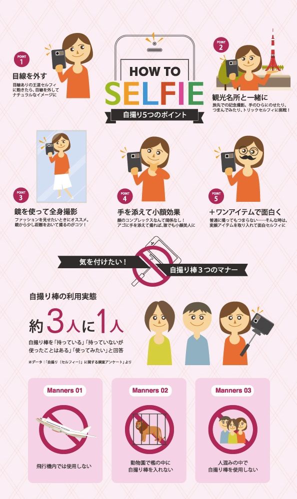 そこで自撮りを上手に撮るコツはないかと探していると、こんなインフォグラフィックを発見!その名もズバリ「120%のかわいさで撮れる『How to セルフィ』」(株式会社アスカネット「フォト総研」)! 今ではすっかり写真を撮るときの必須アイテムとなった自撮り棒のマナーも描かれています。