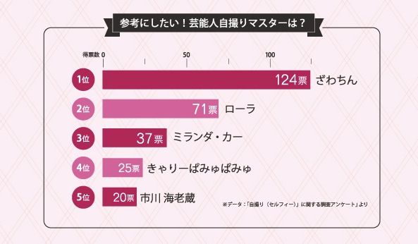 ちなみに同記事には、「参考にしたい!芸能人自撮りマスターは?」というデータも。結果は以下のようになったようです。