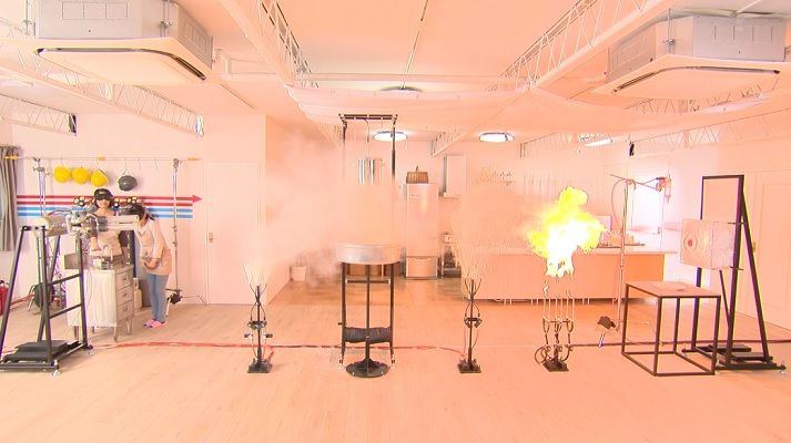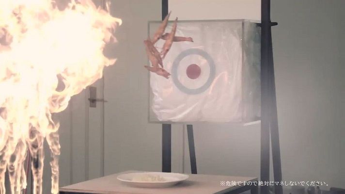 「エビフライ」篇は、装置の仕掛けはすべて独自プログラムによりボタン1つで発動。射出のタイミングに合わせコンマ1秒単位で小麦粉、卵、パン粉、炎が発動するように設計。