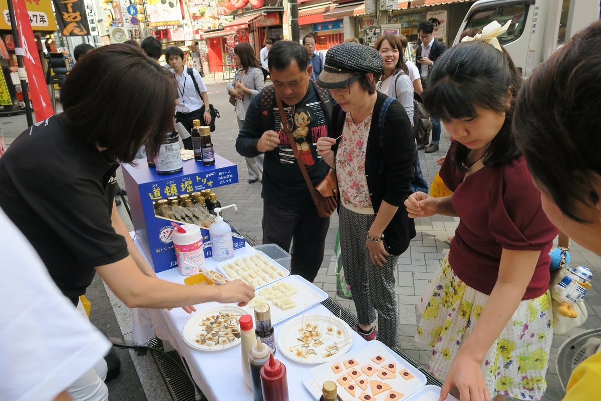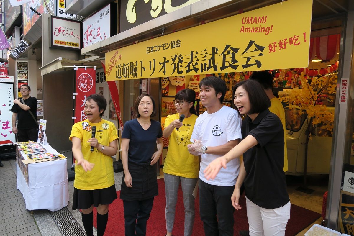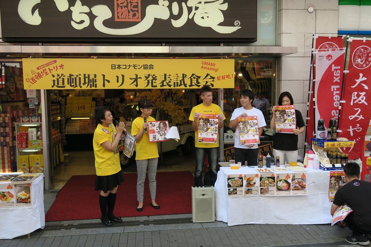9月15日、道頓堀の中心にあるお土産店「いちびり庵」前で、道頓堀トリオの開発に携わった「美津の」「でん」「千陽」「福太郎」などの店主たちとともに、日本コナモン協会の熊谷真菜会長らが試食会を実施。通りかかった外国人客らに振舞った。
