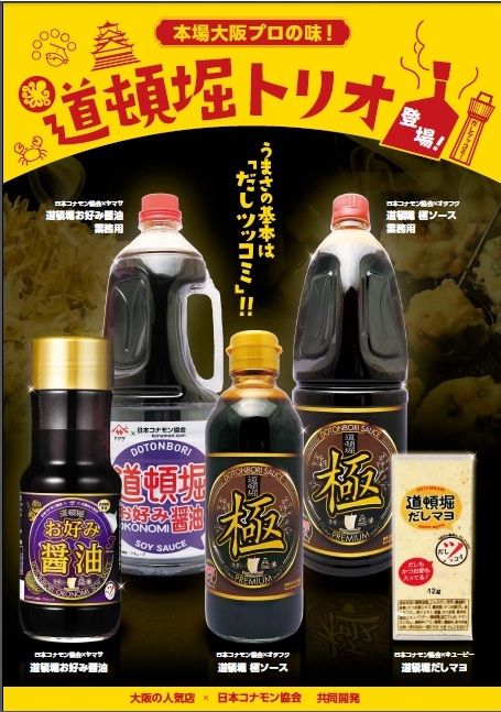 その名も「道頓堀トリオ」。大阪からたこ焼きやお好み焼きといった粉もんの普及に努める日本コナモン協会と、道頓堀の人気お好み焼き店主たちがコラボレーションし、万能調味料を企画、開発した。「道頓堀お好み醤油」「道頓堀極ソース」「道頓堀だしマヨ」の3種類で、いずれも粉もん料理に欠かせない素材。醤油はヤマサ、ソースはオタフク、マヨネーズはキューピーが協力した本格仕様だ。