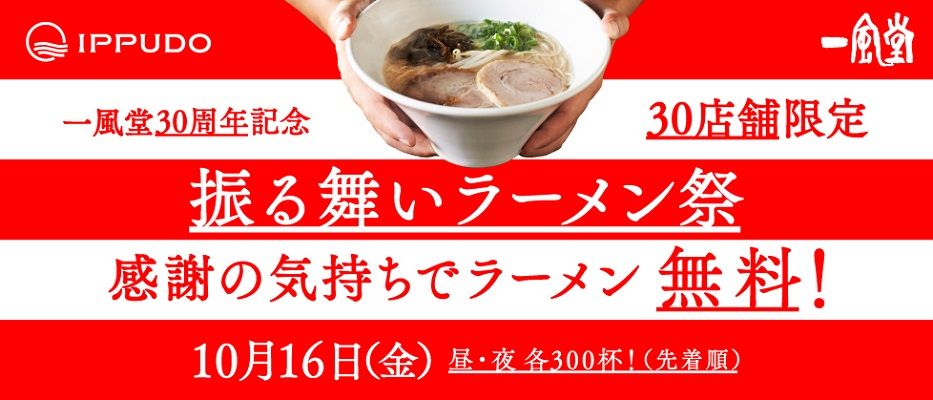 あの人気ラーメン店『博多 一風堂』が、10月16日に創業30周年を迎えるのに合わせて、看板商品の「白丸元味」と「赤丸新味」を無料で提供するイベント『振る舞いラーメン祭』を全国30店舗で開催する!