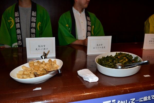 おかずのラインナップは、南魚沼市の「八色しいたけの石づきニンニクバター炒め」や「和豚もちぶたのとんかつ」、十日町市の「トオカマチ米粉パン」や「妻有(つまり)ポークのしゃぶしゃぶ」、津南町の「大根スティック」に、湯沢町の「からいすけ」、魚沼市の「光かぶ漬け」や「山うどの姿煮」などなど、まだまだ紹介しきれないほどの絶品グルメが並んだ。