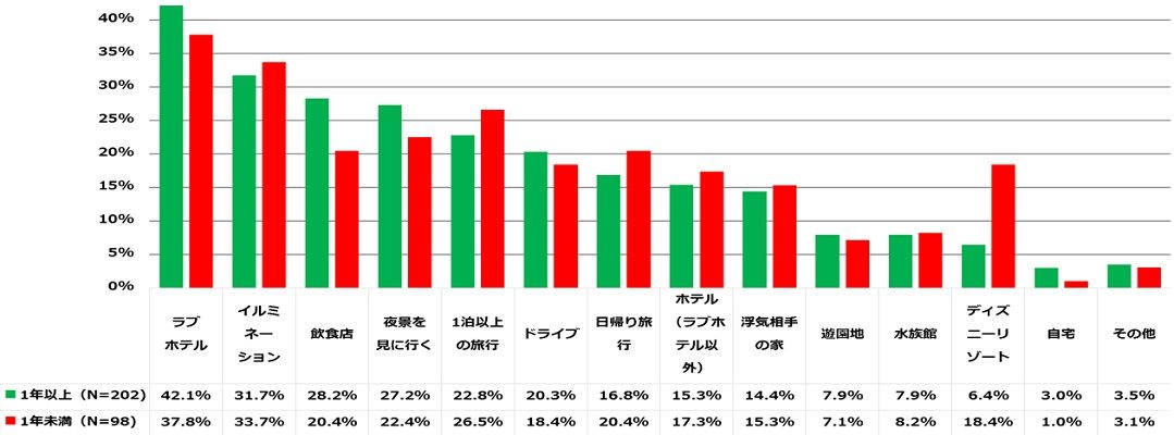 その浮気相手とどのような場所に行きたいか?という問いには、クリスマス時期の定番デートスポットである「イルミネーション」や「夜景」、「飲食店」という回答が多かった。