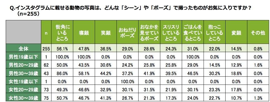 さて、そんな動物たちの写真をよく見かける場といえばSNS。中でも写真メインのSNS・インスタグラムでは、その機会も多くなります。【インスタグラムx動物の写真】。今回は、この2つに関する面白い調査についてご紹介いたします(株式会社アスカネットによる全国の10〜30代の男女330名を対象にしたアンケート)。