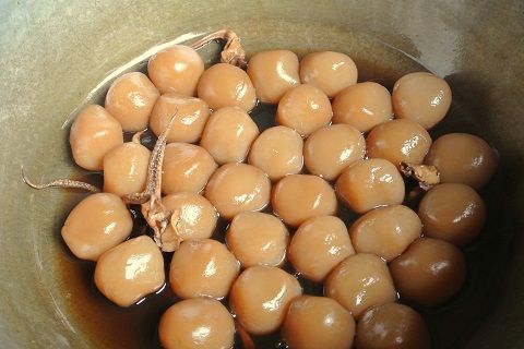 おでんに欠かせない具の1つ、こんにゃく。山形でのこんにゃくといえば「玉こんにゃく」です。略して“玉こん”。直径3〜4cmの玉状の、見た目もかわいいこんにゃくです。通常、しょうゆベースのたれで煮込み、串にさして食べます。