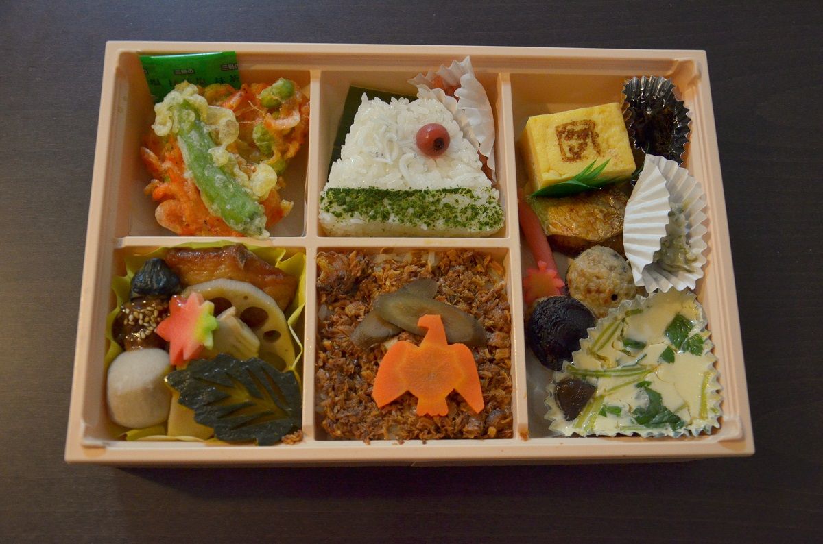弁当の中身は、富士山をイメージしたおむすび、鷹の羽がモチーフのごぼうのせ牛ごはん、徳川家康公が愛した茄子田楽など。まさに「一富士二鷹三茄子」が弁当で“再現”されています。ちなみに、家康公の趣味も鷹狩り。桜えびやブリ、久能の葉生姜、本山茶など駿河の特産品を生かした料理も入っています。