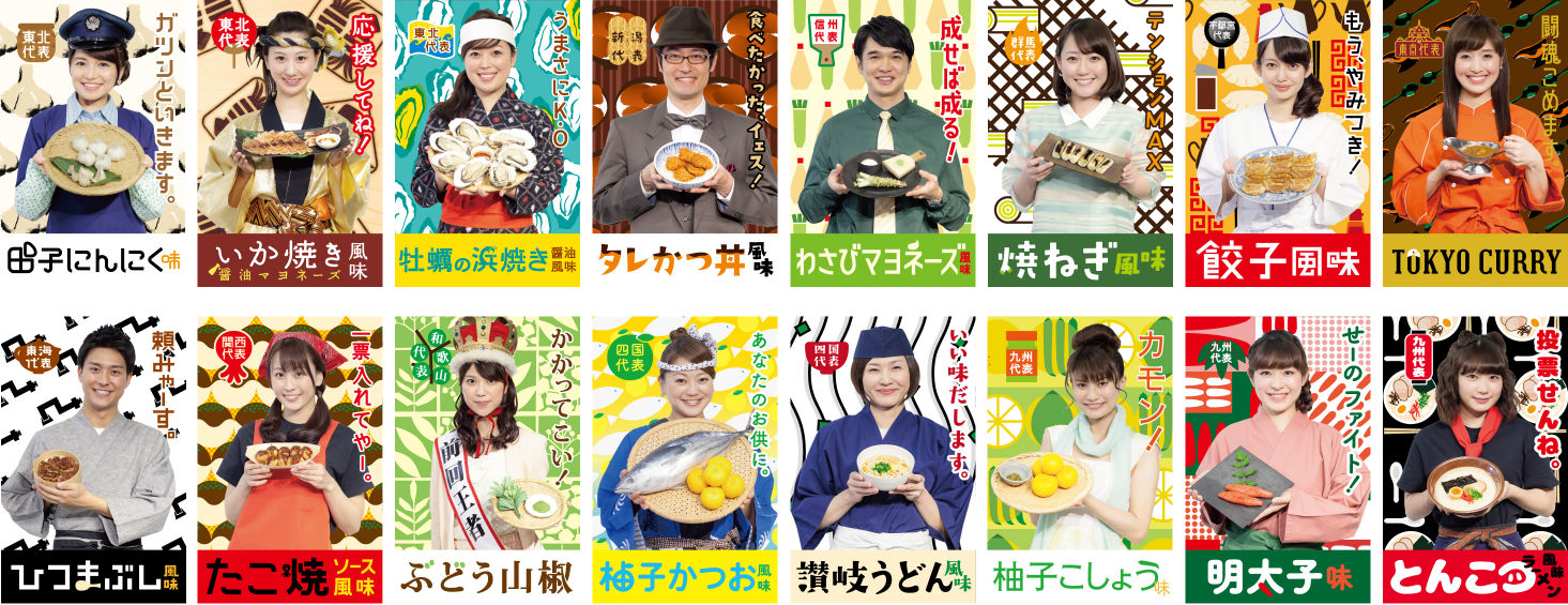 北は青森から南は鹿児島まで16種類のご当地味があり、さらに同キャンペーンを盛り上げるのは商品だけでなく各地にゆかりのある16人の若きアナウンサー(=アナの種)とタッグを組み全国デビューを目指すのだ!