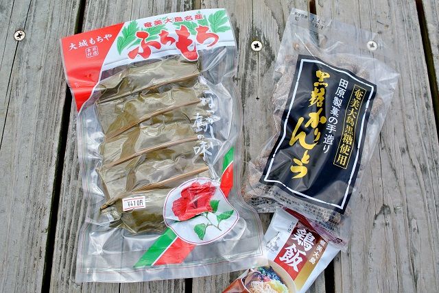 よもぎを練り込んだ、奄美大島の黒糖で作った真っ黒なお餅が「ふちもち」です。ふちとは、奄美の表現でよもぎのこと。餅は月桃(げっとう)という葉で包まれています。これもさまざまな業者が製造、販売していますが、田原製菓の近くにある「大城もちや」のふちもちがおすすめです。黒糖ならではの味わい、よもぎの爽やかな風味が堪能できます。日持ちもします。