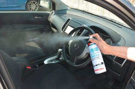 シューッと吹きかけるだけで車内を冷却できるスプレー。液剤の気化熱を利用して周囲の熱を奪い温度を下げてくれます。