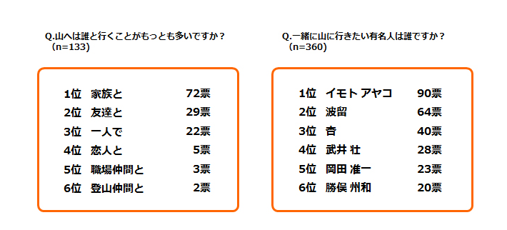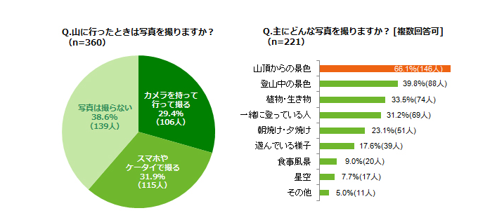 続いては、山と写真に関するアンケート。カメラを持っていって撮るという方が3割、そうでなくてもスマホなどで撮るという方が3割と、半数以上の方が山に行くと写真を撮るようにしているようです。そして被写体の人気ナンバーワンは、もちろん「山頂からの景色」。ただの絶景ではなく、自分が頑張って登りついた先の絶景というのは、やはり特別なものがあるのでしょう。