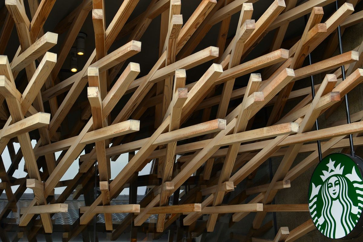 店舗デザインを担当したのは、国際的に有名な建築家で、東京五輪に向けた新国立競技場のデザインも担当する隈研吾氏です。スターバックスジャパンのホームページによると「自然素材による伝統と現代の融合」というコンセプトをもとに設計されたとのこと。木組み構造は天井そして壁に続き、お店の奥には小さな庭があって太宰府天満宮のシンボル「梅」の木も植えられているというこだわりようです。