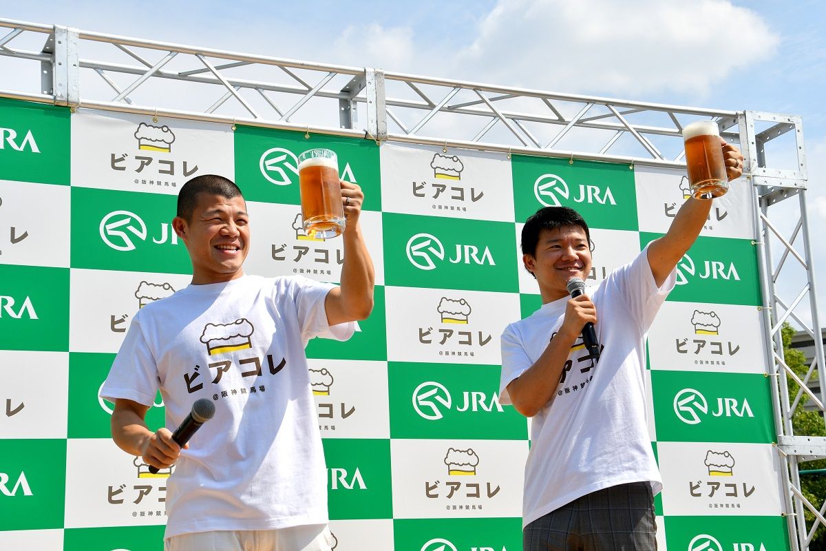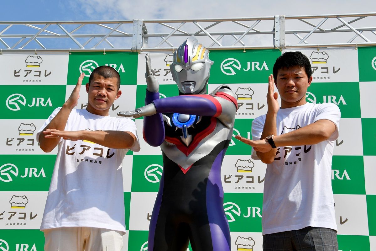まず、亀田兄弟がステージにさっそうと登場。阪神競馬場の期間限定オリジナルビール「ウマ勝った!」を手に、おなじみ「シャ、オラ〜〜!」の掛け声とともに乾杯した。その後、光の戦士・ウルトラマンオーブがステージ上に現れ、必殺光線「スペシウムゼペリオン」を亀田兄弟に伝授し、集まったファンや家族連れらから拍手喝采を浴びていた。