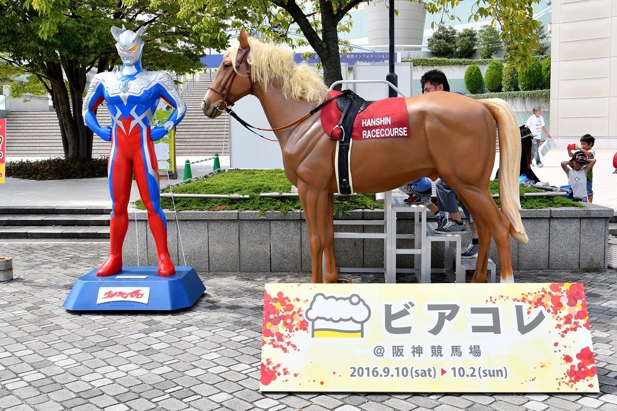 阪神競馬場で現在開かれている、ご当地ビールや世界各国のグルメ、そして、テレビ放送開始50年を向けるウルトラマンとコラボレーションしたイベント「ビアコレ@阪神競馬場」(2016年10月2日まで土日開催)での1コマ。