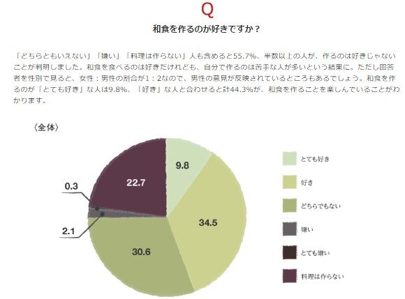 他にも「これからの和食を考える」では、2万人以上の会員を対象にした和食に関するアンケートを実施。和食を食べることについて96.2%とほぼ全員が好きであると答えたのに対して、和食を作ることが好きかどうかについては44.3%にまで低下する。和食を作ることが好きではない理由として、やはり作る手間や時間、おいしく作ることが難しいといった家庭で和食を食べることの課題が浮き彫りとなっている。
