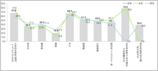 自分の健康について夫婦ともに気にしている「症状・病気」として66.4%が「がん」と回答。男性の内訳は55.1%が胃がん、54.4%が大腸がん、女性の内訳は78.6%が乳がん、64.1%が子宮・卵巣がんとなっています。