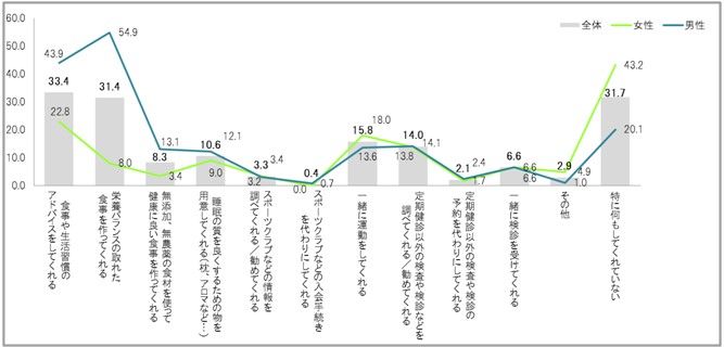 一方、夫が妻のために実際に行動している事として、「あなたの配偶者があなたの健康のためにしてくれていると感じる気遣いや行動」についての妻の回答を見てみると、なんと最も高いスコアは「特に何もしてくれていない」(43.2%)という、さらに残念な結果になっています。