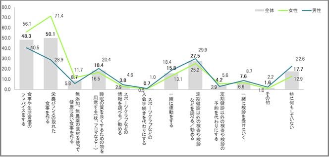 夫妻双方に配偶者の健康のために行っている気遣い・行動としてスコアが高かったのは、「食事」に関することで、特に妻は「栄養バランスの取れた食事を作っている」が71.4%、「食事や生活習慣のアドバイスをする」が56.1%となっています。また、「あなたの配偶者があなたの健康のためにしてくれていると感じる気遣いや行為」について、夫は「栄養バランスの取れた食事を作ってくれる」が54.9%、「食事や生活習慣のアドバイスをしてくれる」43.9%と回答しており、妻が行っている気遣い・行動はきちんと伝わっていることがわかります。