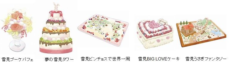 雪見だいふくが沢山つまった「ドリーム雪見」は全部で5種類。大切な人に感謝を伝えるのにピッタリな『雪見ブーケパフェ』や、ピンクと白の「雪見だいふく」とフルーツで作られた可愛いハート型の『雪見BIG LOVEケーキ』、月への思いをはせる可愛らしいうさぎが特徴的な『夢の雪見タワー』、世界各国のイメージにそった雪見ピンチョスで世界地図をあしらった『雪見ピンチョスで世界一周』、雪見うさぎが100匹ひしめく可愛らしいお菓子の世界が楽しめる『雪見うさぎファンタジー』の中から、好きなケーキを選ぶことができる。