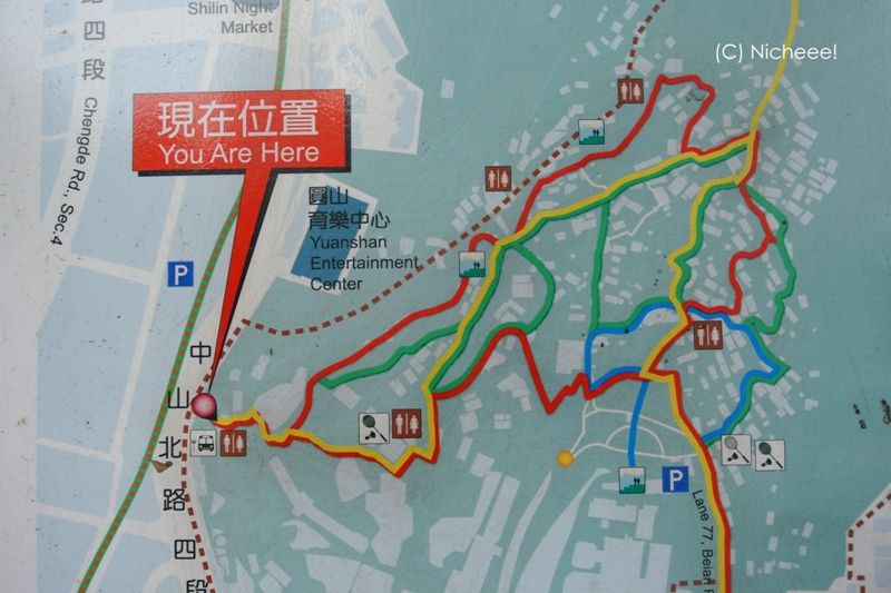 最寄り駅は、台北駅も経由するMTR淡水線の劍潭駅。徒歩10分ほどの場所に、劍潭山へのなかなか立派な登山口の山門があります。地図やホームページによると、劍潭山の登山道はいくつかあるようで、いずれも「劍潭山親山步道」という名称がついています。台北の老舗ホテルとして有名な「圓山大飯店」近くにも別の登山道があります。