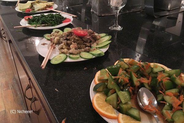 エジプトといえば、スパイシーな味を期待していました。外の屋台で食べると、一口でスパイシーな味わいに遭遇しました。しかし、日本人向けに作られた料理は、味が薄い、もしくは味がない。ツアーの参加者が高齢な方々ばかりだからでしょうか、刺激の強いものはダメなのか。残念ながら、エジプトらしさがまったく感じられない食事は、残念そのものでした。
