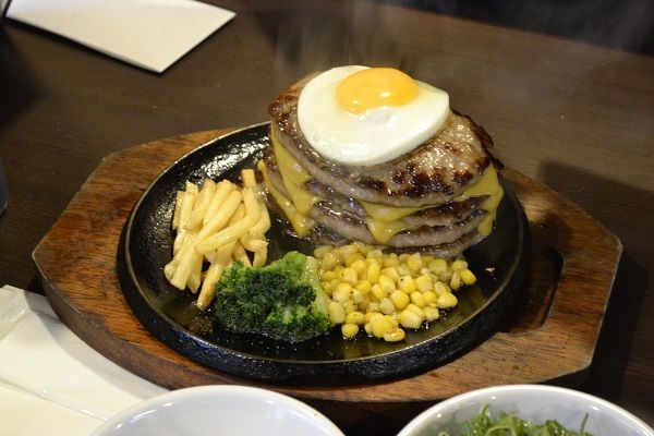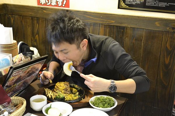 4段のハンバーグに、青ネギや大根おろし、オリジナルソースやカレーをかけたりと、様々な食べ方でどんどん胃の中に運んでいく、わっきーさん。