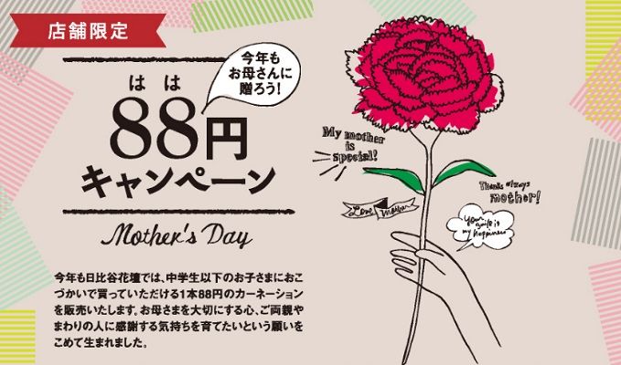 そして最後は、お母さんに感謝の気持ちを伝えたい学生さんのために、1872年創業、全国に約200店舗を展開する日比谷花壇が、母の日の前日と当日(5月13日と14日)の2日間、全国のHibiya-Kadan Style及び日比谷花壇店舗(一部店舗除く)で、カーネーションをなんと1本88円という、お小遣いでも買える金額で販売するぞ!